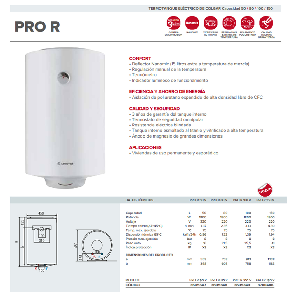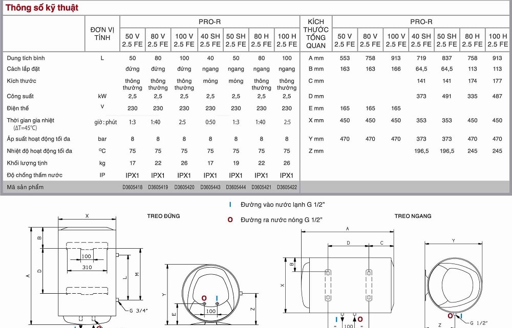 2/ THÔNG SỐ KỸ THUẬT BÌNH NÓNG LẠNH ARISTON PRO-R 50L 50 LÍT NGANG Và ĐỨNG