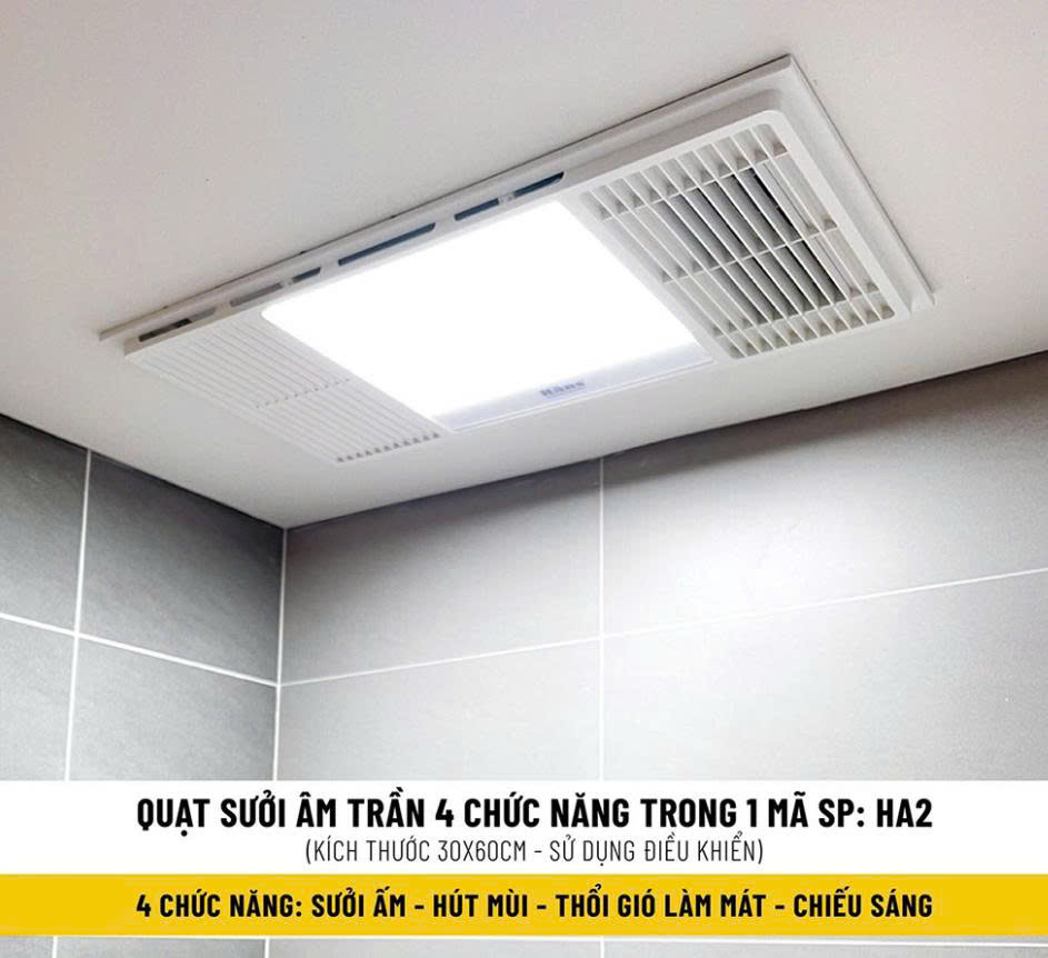 - Tích hợp 4 chức năng : Thổi nóng, thổi mát, thông gió, chiếu sáng