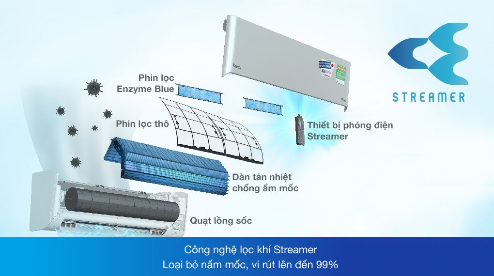 Công nghệ Streamer phân hủy vi khuẩn và nấm mốc bám trên phin lọc dưới hình thức phóng điện plasma, tạo ra những dòng electron ở tốc độ cao. Những electron này va chạm và kết hợp với nitơ, oxy để tạo ra các phân tử có khả năng phân hủy nhanh hơn 1000 lần so với phương pháp phóng điện plasma thông thường.