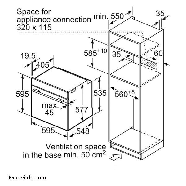 Kích thước lắp đặt (CxRxS): 585-595 x 560-568 x 550 mm