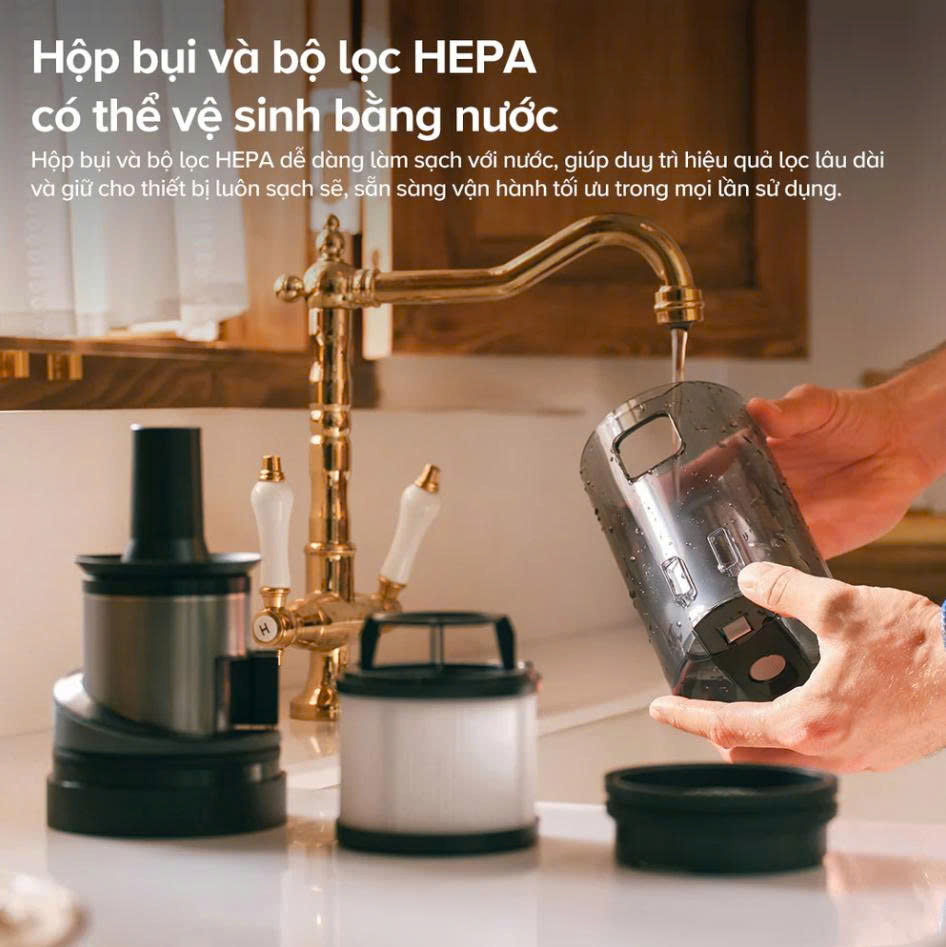 - Công nghệ tách bụi 9-cyclone: Phân tách bụi và rác hiệu quả, cùng lưới lọc kim loại dạng xoắn giúp điều hướng tóc và mảnh vụn đi thẳng vào hộc chứa.