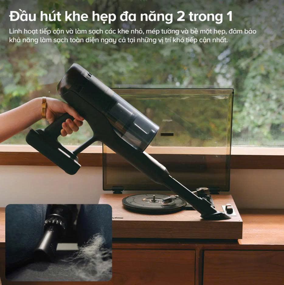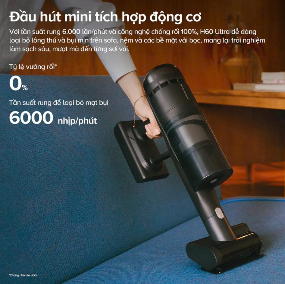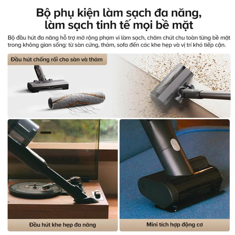 - Bộ phụ kiện đa năng đi kèm: Đầu hút chống rối cho sàn và thảm; Đầu hút khe hẹp; Đầu mini có động cơ cho sofa, giường nệm