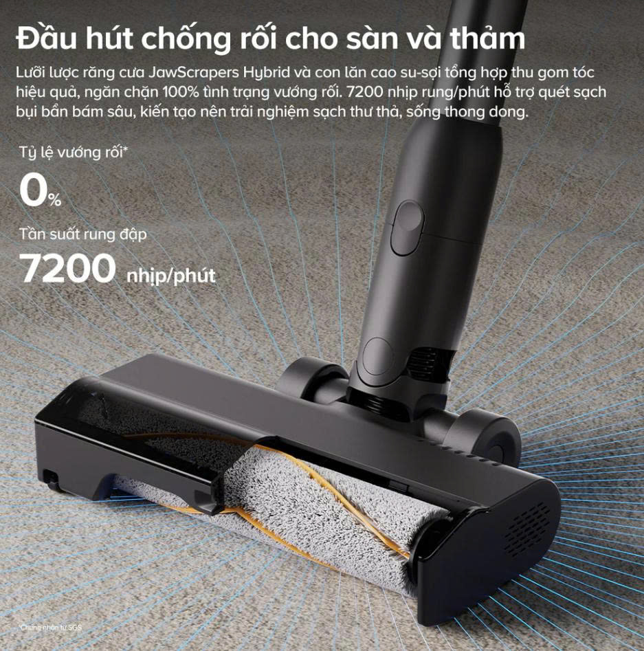 - Đầu hút chống rối cho sàn và thảm: Trang bị lưỡi lược răng cưa JawScraper Hybrid và con lăn cao su giúp thu gom tóc, ngăn tình trạng tắc nghẽn do rối.