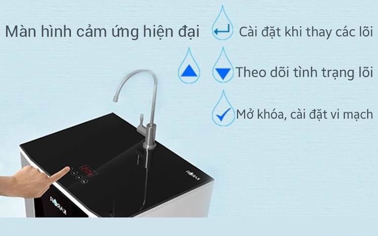 Phần tủ ngoài có trang bị màn hình LED bên trên mặt kính cường lực giúp hiển thị rõ thời gian thay lõi cũng như các chỉ số của nước.