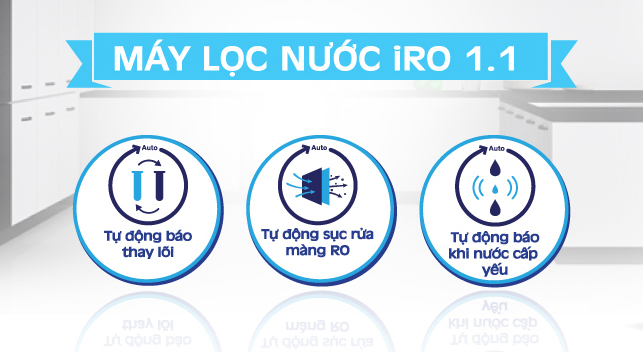 - Tự động báo nước cấp yếu: Khi nước cấp đầu vào mất hoăc yếu, máy sẽ đưa tín hiệu cảnh bảo. Nếu nước đầu vào mất hoàn toàn thì màn hình sẽ hiển thị lỗi Er4, còn nếu nước cấp đầu vào không ổn định, thì máy sẽ báo lỗi Er2. Lỗi Er2 còn xuất hiện khi lõi số 1 bị tắc bẩn và cần phải thay thế.