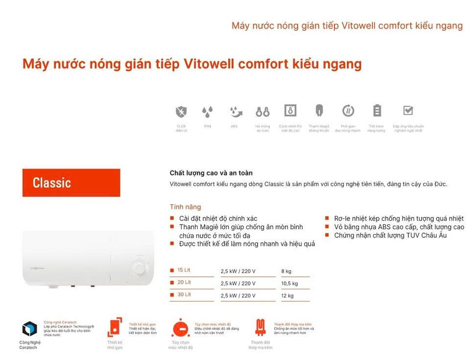 • Máy nước nóng gián tiếp Vitowell comfort kiểu vuông dòng Classic là một sản phẩm uy tín, ứng dụng công nghệ tiên tiến của Đức.