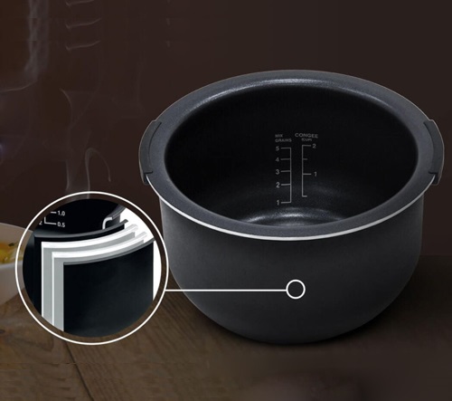 Nồi cơm điện tử Sharp KS-IH190V được thiết kế với lòng nồi có 6 lớp, giúp truyền nhiệt vào tận lõi của hạt gạo, cho cơm chín đều, hạt cơm mềm dẻo và thơm ngon. 6 lớp bao gồm: lớp phủ chống dính, lớp phủ, lớp nhôm, lớp thép không gỉ, lớp phủ chịu nhiệt, silicone chống mài mòn.