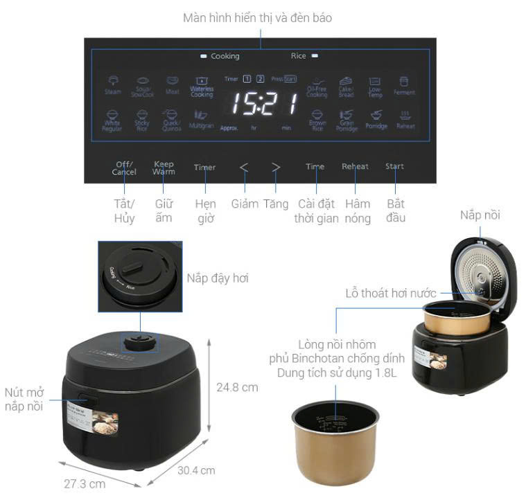 Bên cạnh đó, màn hình hiển thị các chế độ nấu cũng vô cùng rõ ràng, sắc nét, người dùng có thể làm quen sử dụng một cách dễ dàng nhất.