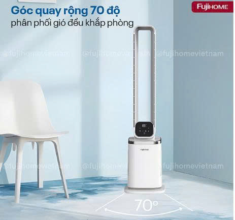 Quạt không cánh có khả năng xoay góc lên đến 70 độ giúp quạt có thể phân phối luồng gió rộng khắp trong không gian, làm mát đều cả căn phòng mà không cần điều chỉnh vị trí quạt nhiều lần. Với tính năng này, Fujihome BF-05R-HEPA phù hợp cho những không gian rộng hoặc khi bạn cần làm mát nhiều khu vực cùng lúc.