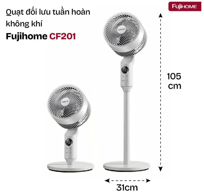 Fujihome CF201 sở hữu thiết kế gọn gàng, thanh lịch với tông màu trang nhã, dễ dàng phối hợp với mọi không gian nội thất từ hiện đại đến cổ điển. Đường kính cánh quạt 18cm cùng chân đế vững chắc 31cm, đảm bảo vận hành ổn định trong thời gian dài. Quạt được thiết kế dạng đứng thẳng, nhỏ gọn, dễ dàng di chuyển và không chiếm nhiều diện tích – lý tưởng cho phòng khách, phòng ngủ, văn phòng làm việc, cửa hàng hay quán cà phê.